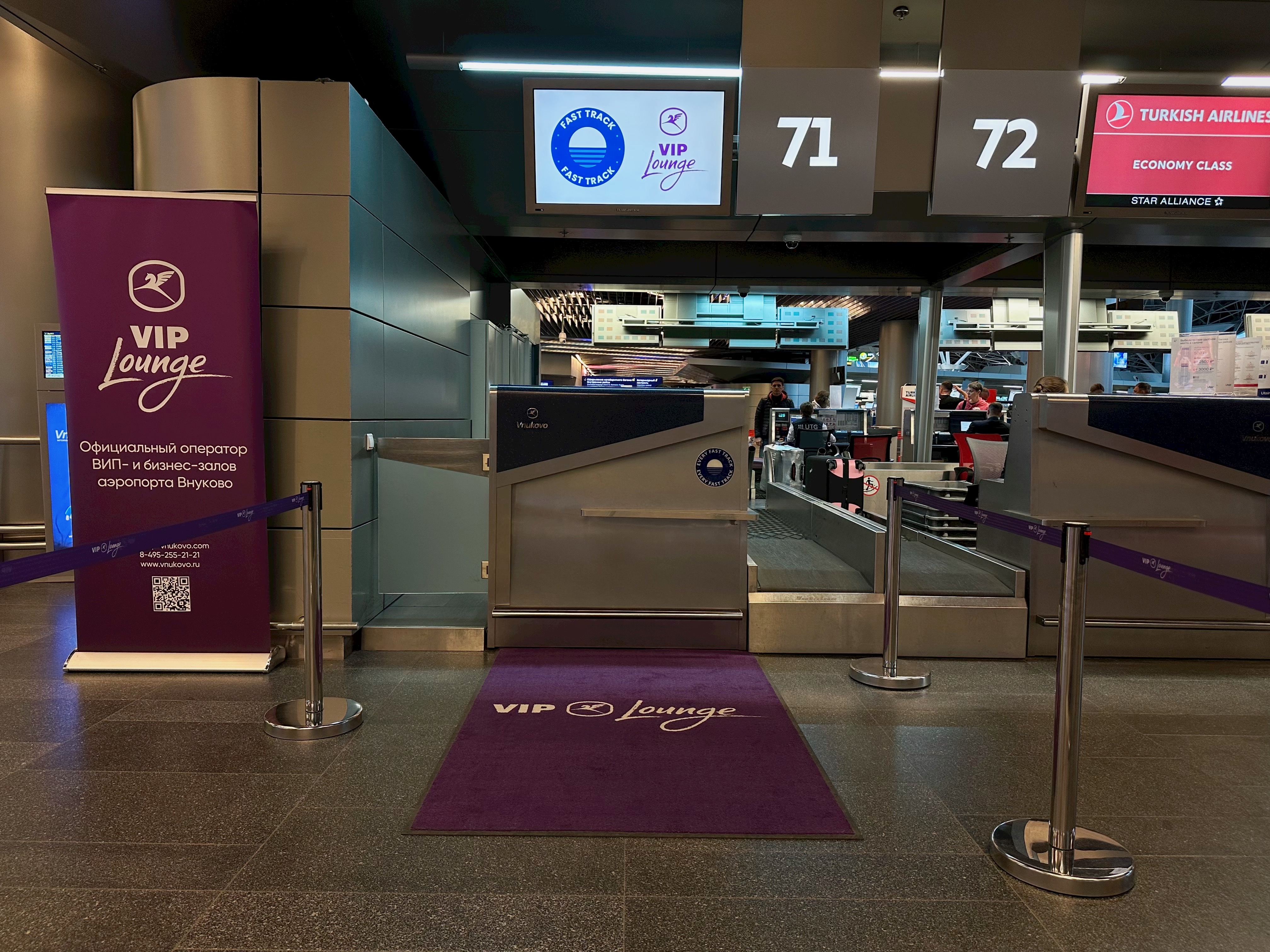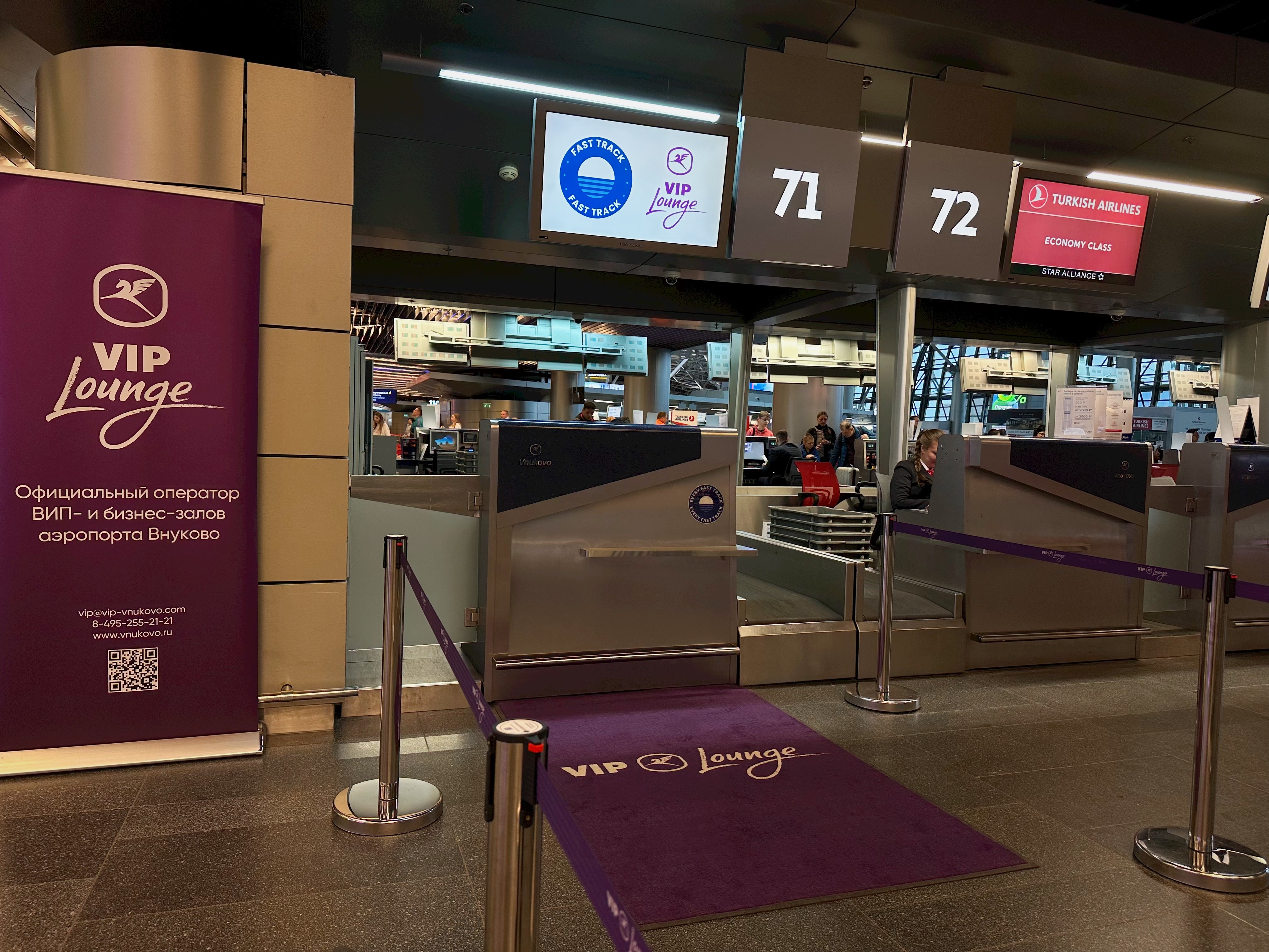 В сервис Fast Track в аэропорту Внуково входит регистрация и сдача багажа на выделенной стойке регистрации, а также прохождение досмотра через выделенную линию бизнес-класса, как на внутренних, так и международных рейсах. После оформления сервиса, необходимо подойти на стойку номер 71, расположенную рядом с выходом на досмотр международных рейсов, для регистрации и сдачи багажа
